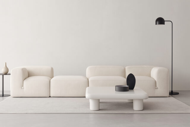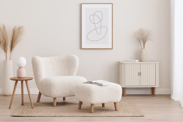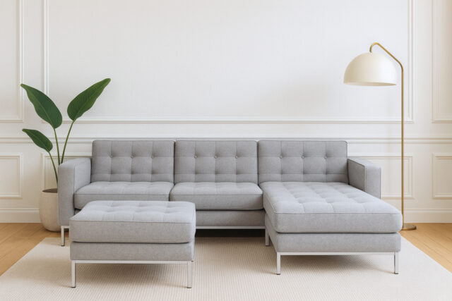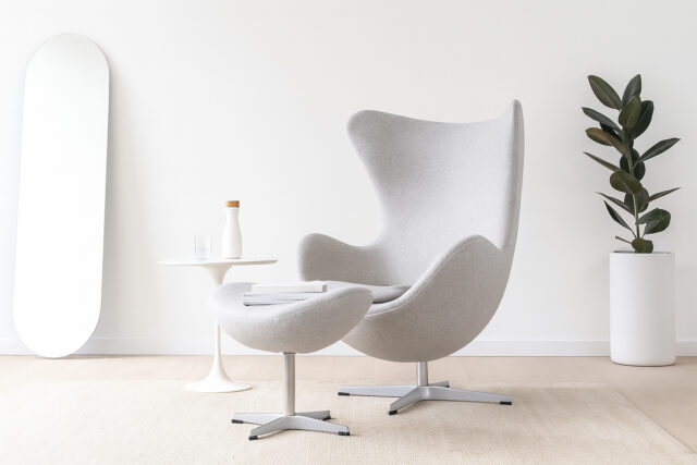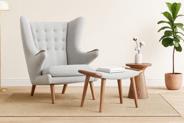 パパベア・オットマン、ライトグレーのウールとウォルナット