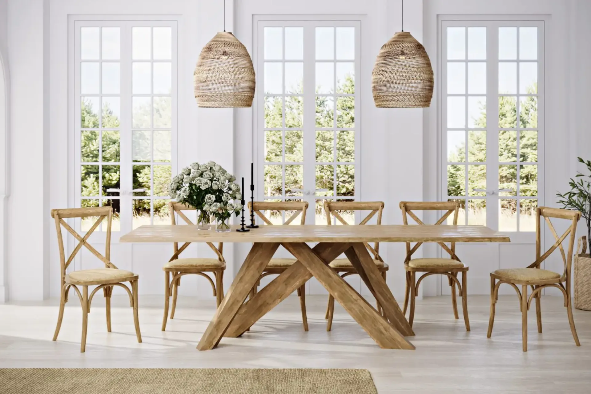 クロスバックダイニングチェアは、手織りのラタンシートと丈夫な木製の背もたれで丁寧に手作りされています。フレンチカントリーデザインにインスパイアされ、伝統的な魅力と現代的なエレガンスが調和した、家やダイニングスペースに最適なアイテムです。