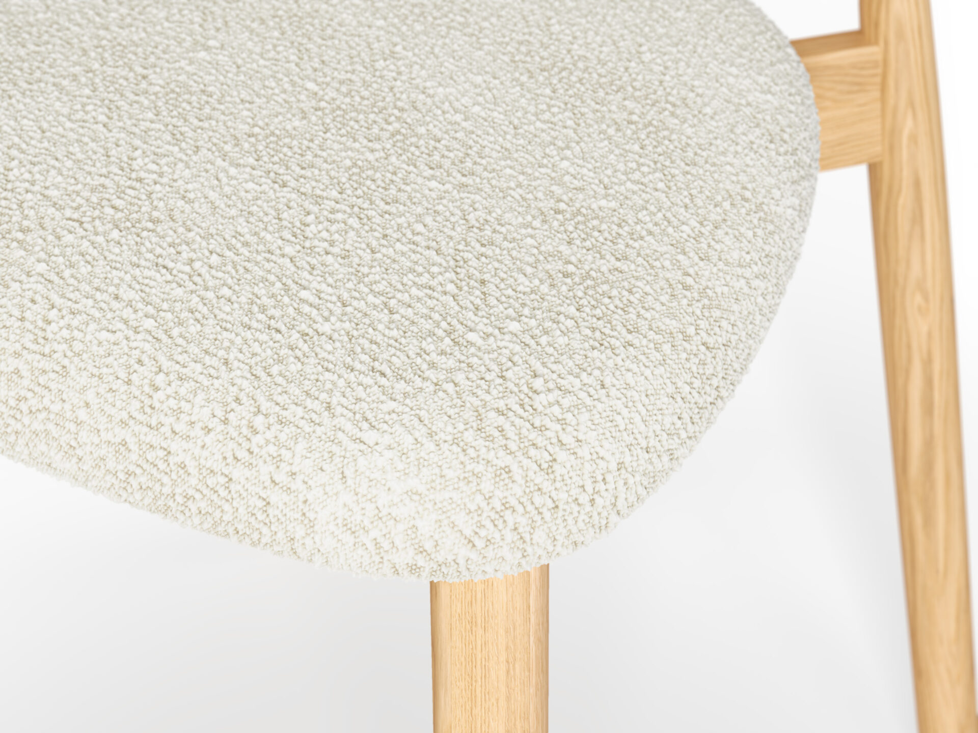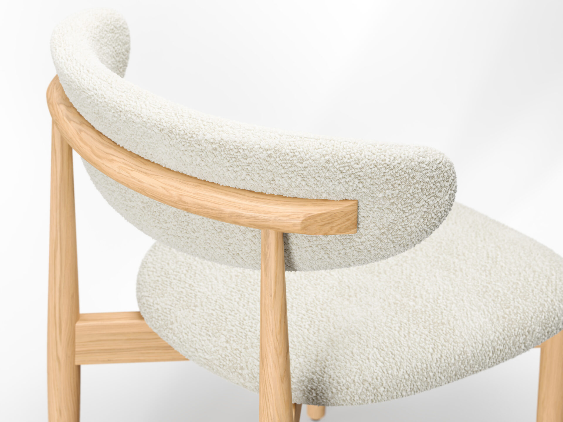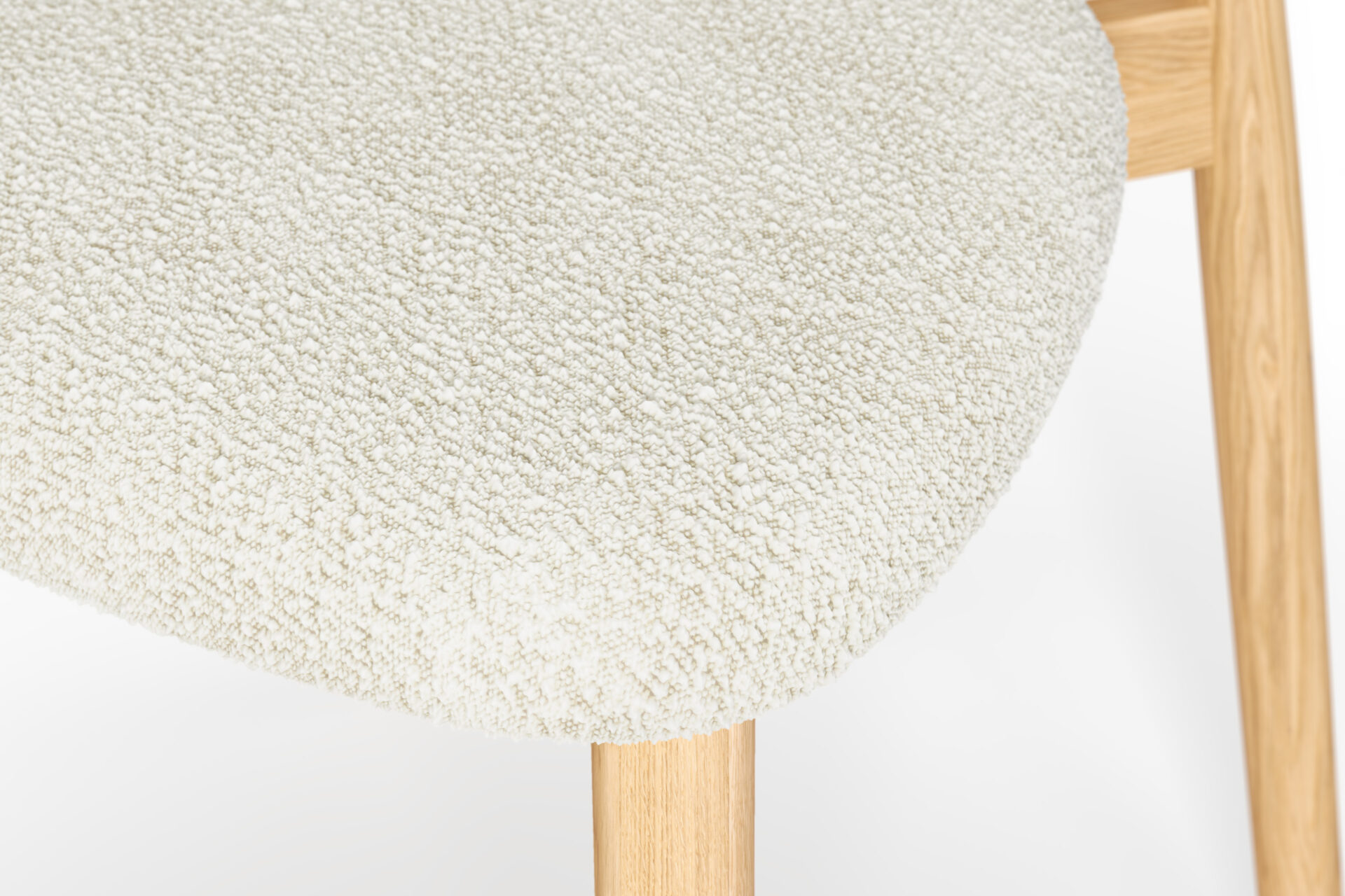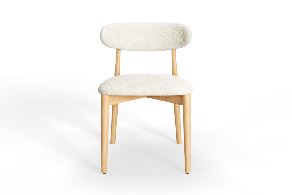 やわらかいトーンのブナ材と雪のようなブークレ素材が、軽くて爽やかな座り心地を演出します。テーブルを明るく彩り、気軽さ、新鮮さ、静かな洗練さを伴った椅子です。