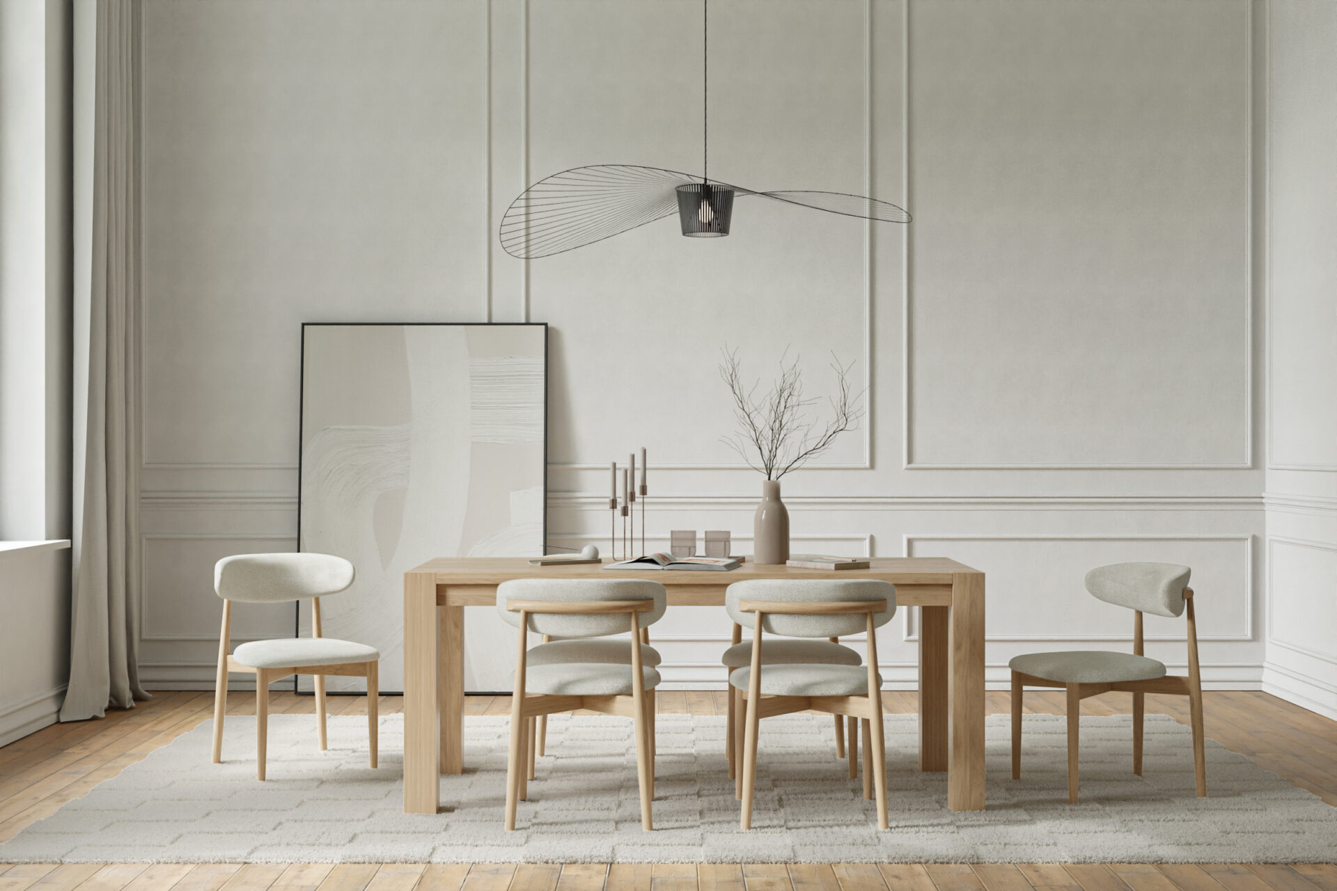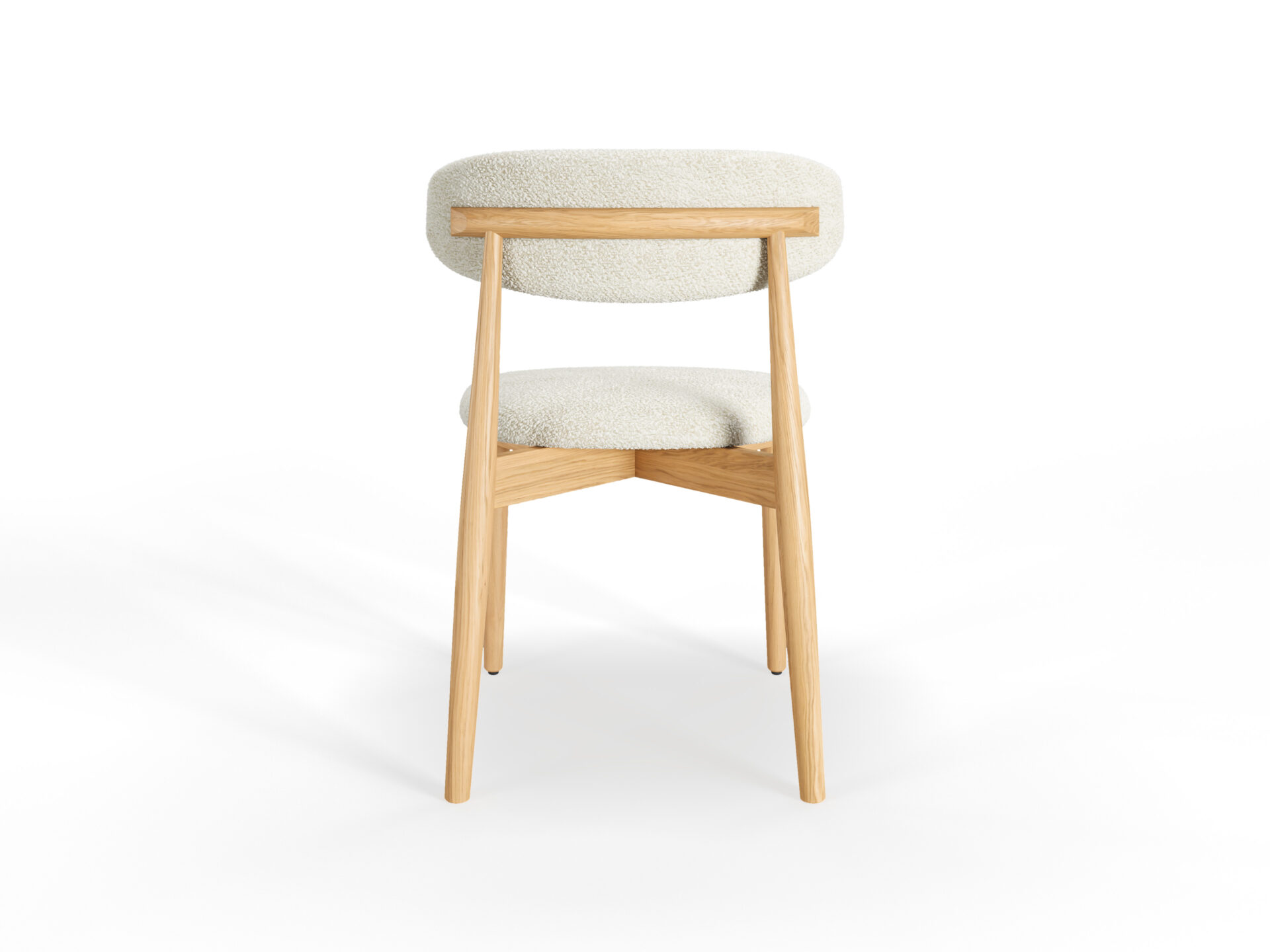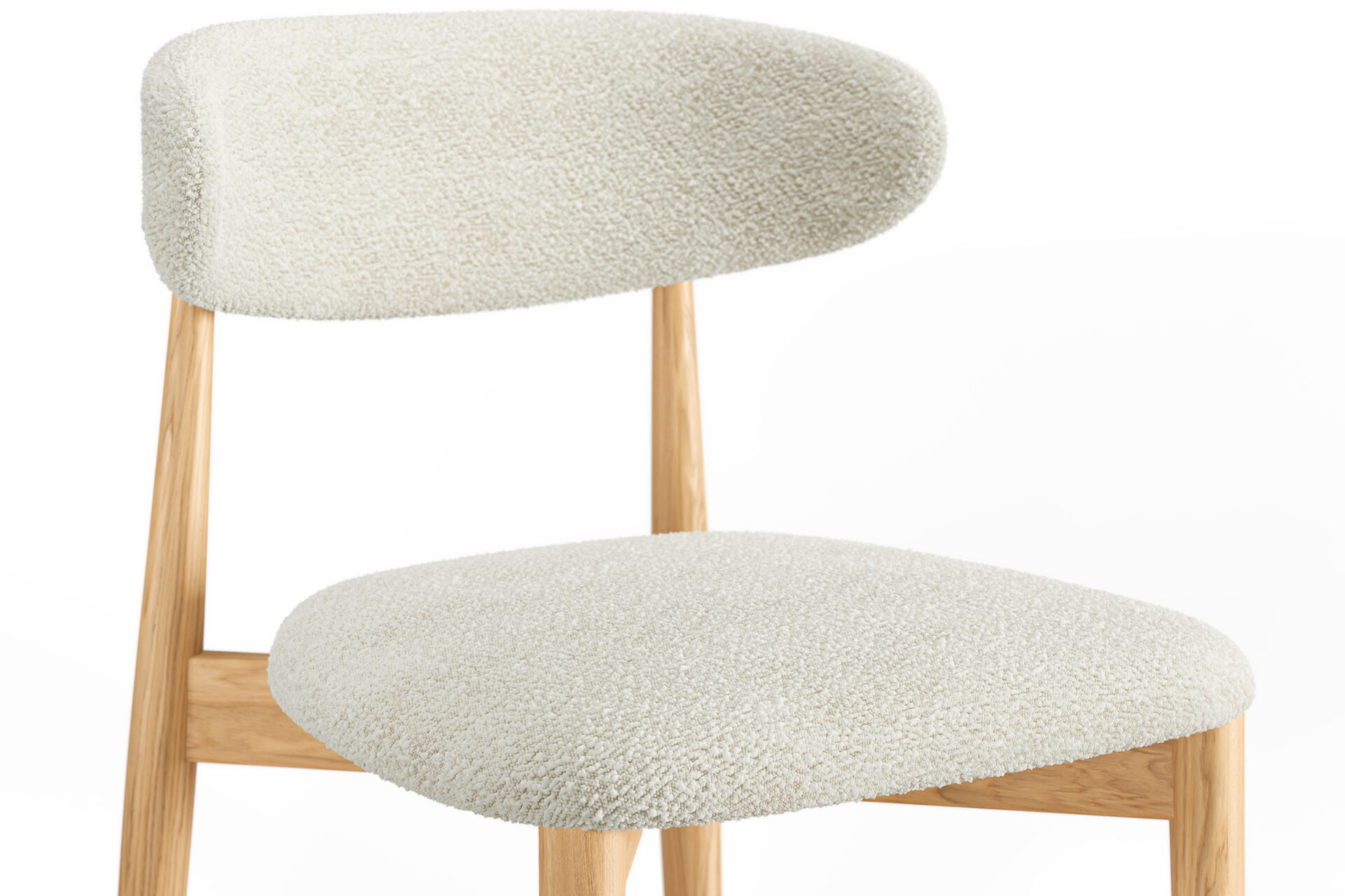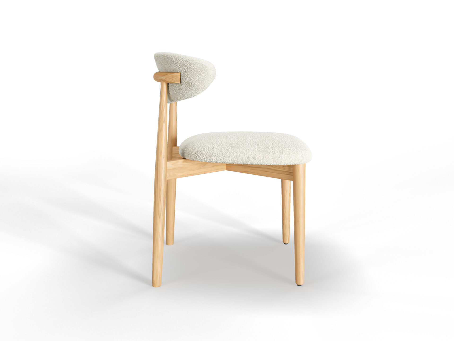 やわらかいトーンのブナ材と雪のようなブークレ素材が、軽くて爽やかな座り心地を演出します。テーブルを明るく彩り、気軽さ、新鮮さ、静かな洗練さを伴った椅子です。