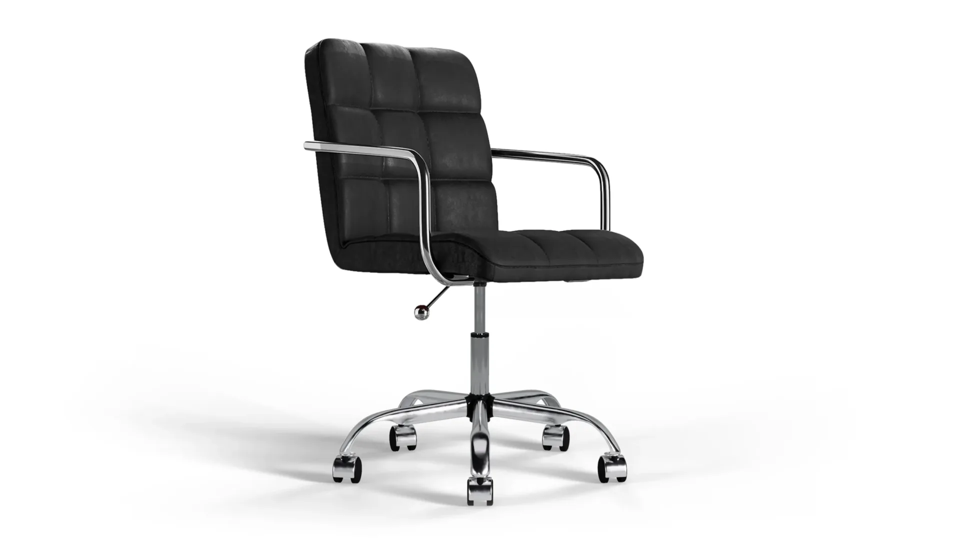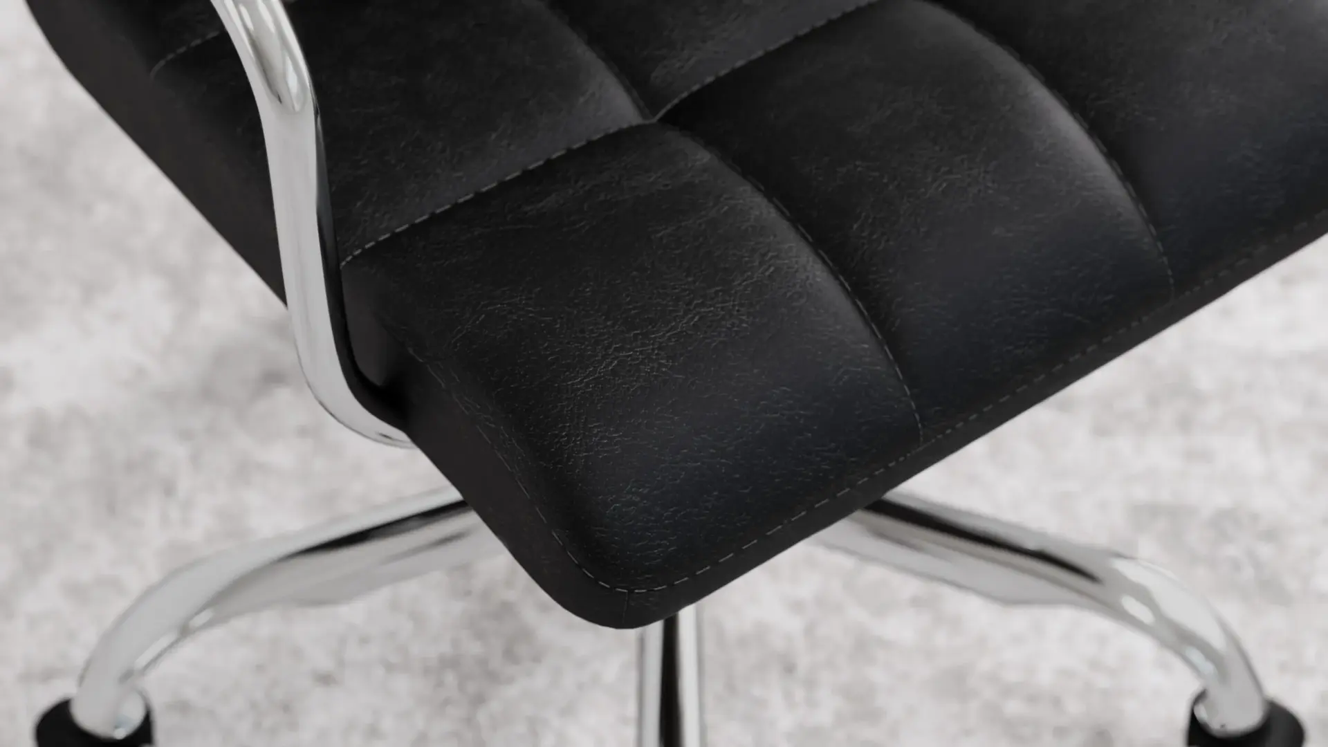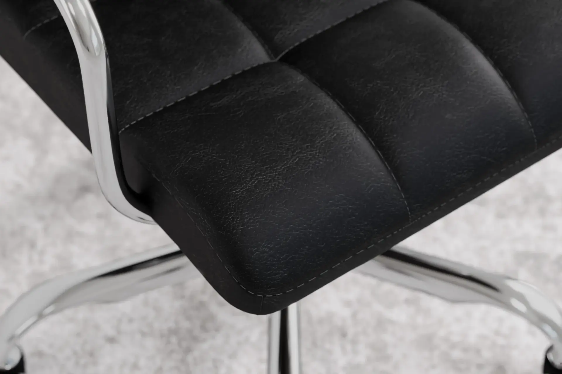 ブラックヴィーガンレザー製のクロームベースとホイールを備えたフューチュラオフィスチェアは、時代を超越した洗練されたデザインと実用的な快適さを融合しています。豊かなクッション、高さ調整、通気性のあるステッチが、持続的なサポートを提供し、磨かれたクロームベースとスムーズなホイールが強度と移動の容易さを実現します。家庭用やオフィス用に最適です。