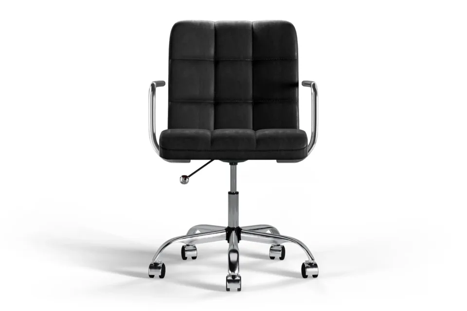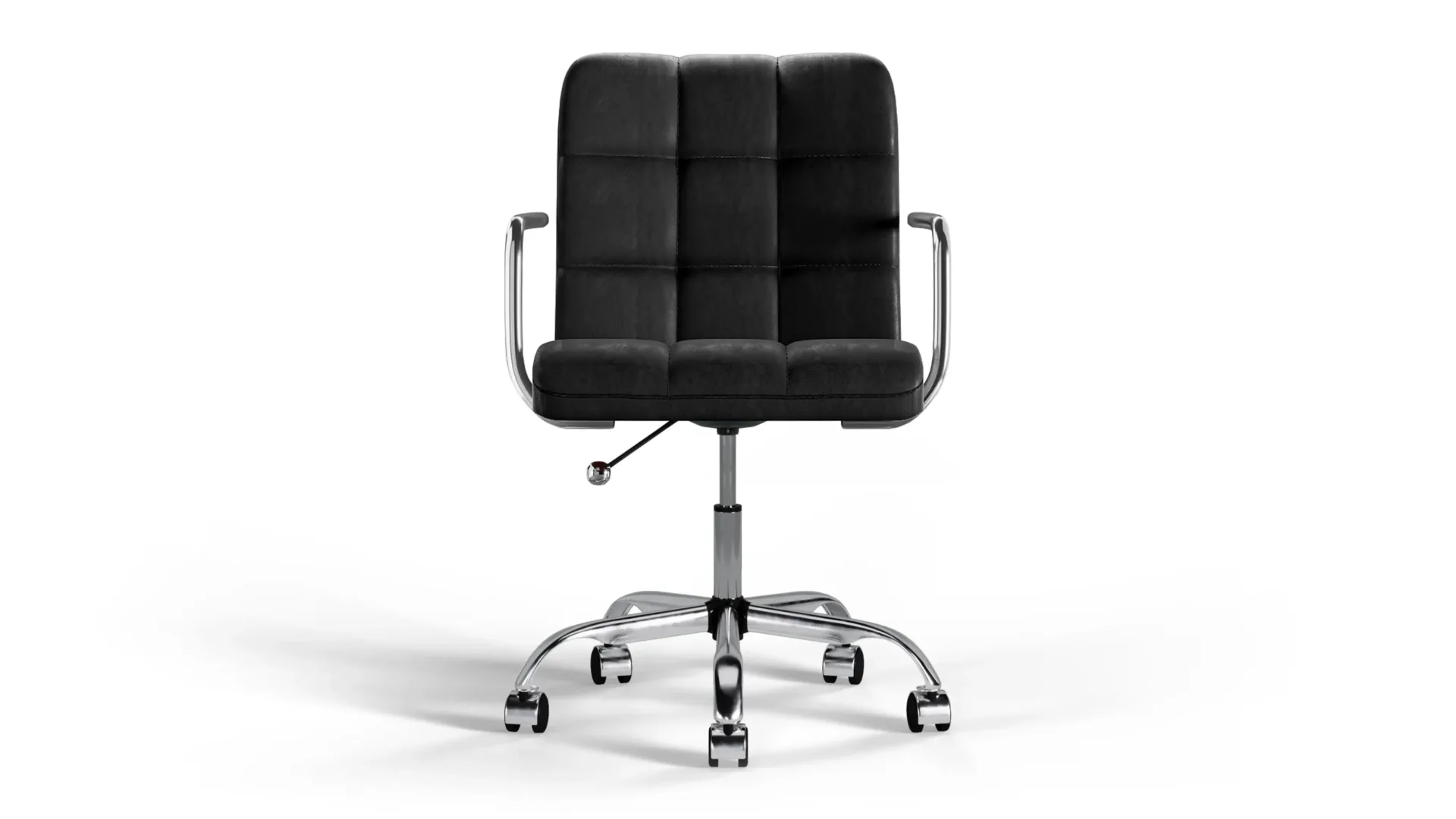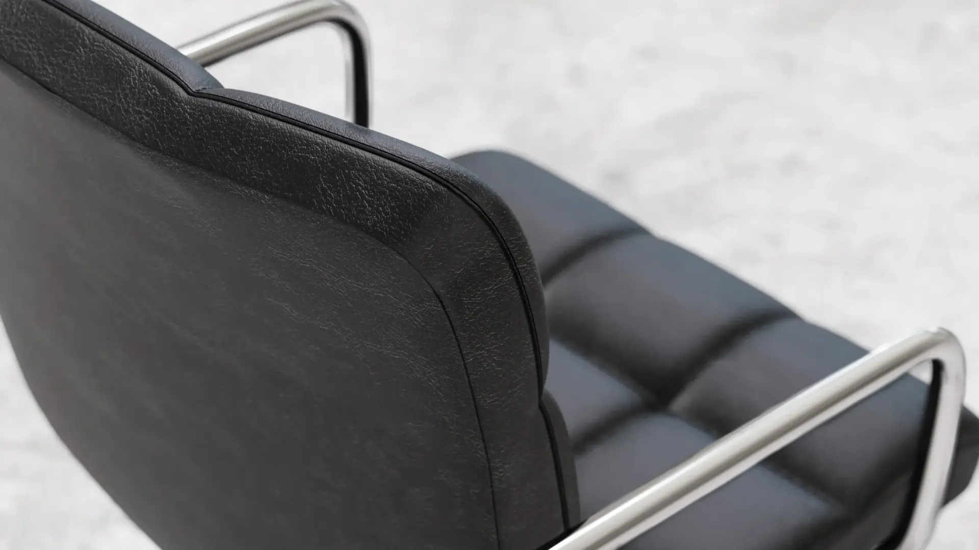ブラックヴィーガンレザー製のクロームベースとホイールを備えたフューチュラオフィスチェアは、時代を超越した洗練されたデザインと実用的な快適さを融合しています。豊かなクッション、高さ調整、通気性のあるステッチが、持続的なサポートを提供し、磨かれたクロームベースとスムーズなホイールが強度と移動の容易さを実現します。家庭用やオフィス用に最適です。