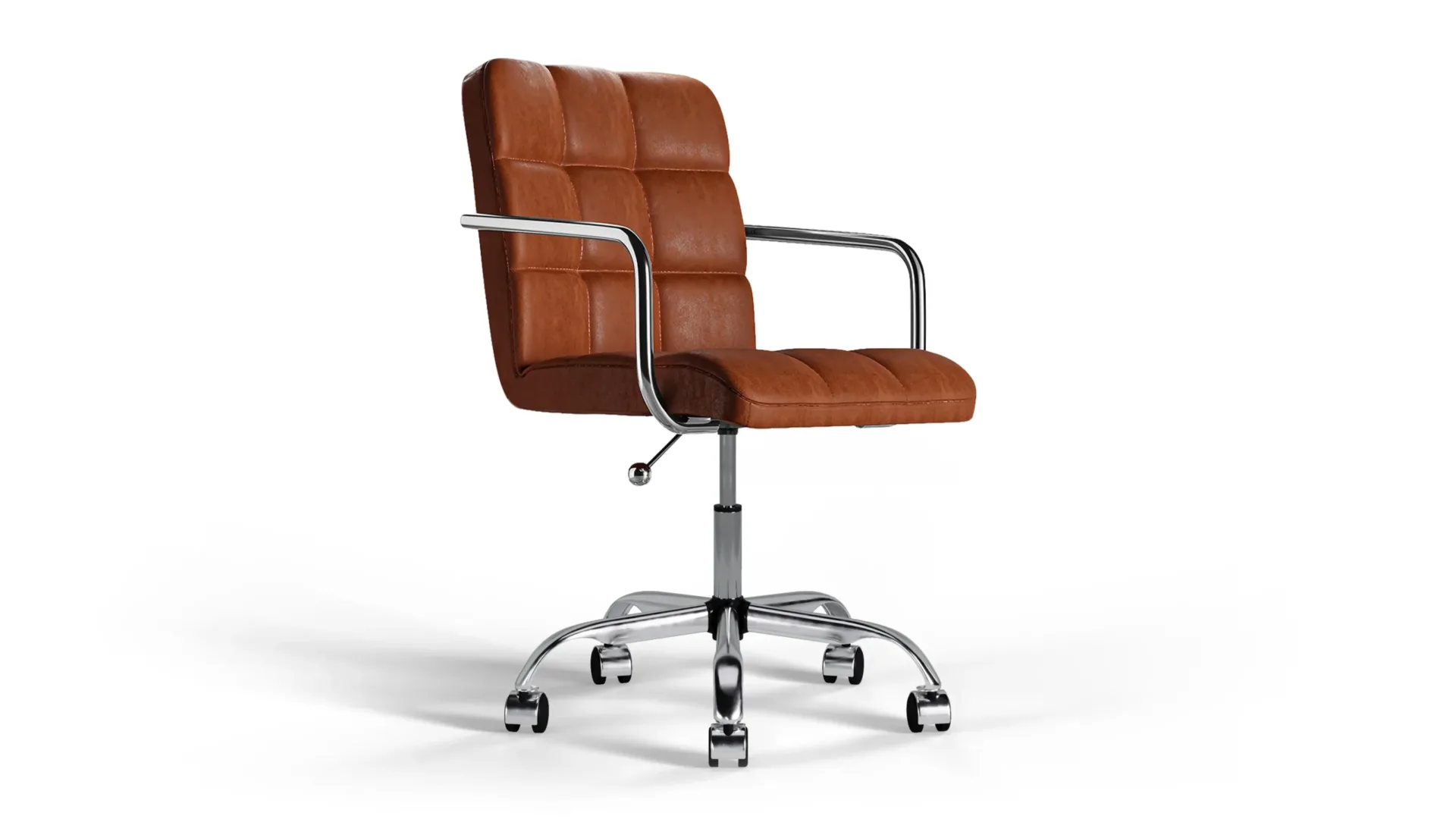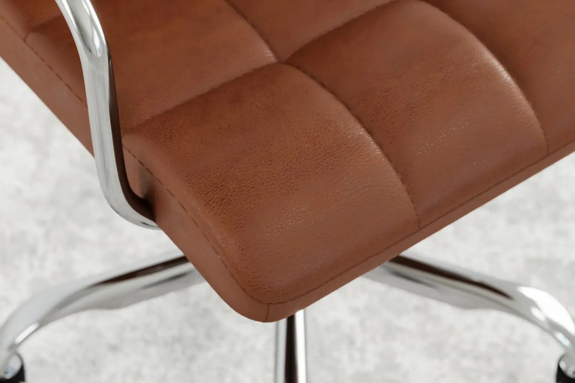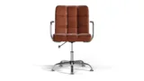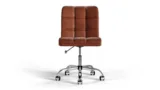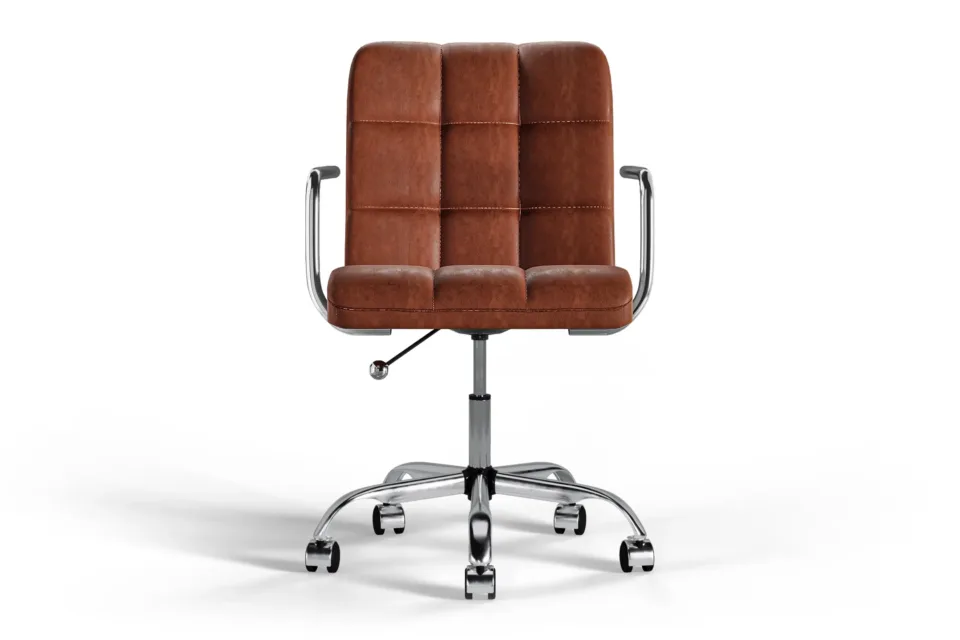 ブラウンヴィーガンレザー製のクロムベースとホイールを備えたFuturaオフィスチェアは、古典的なスタイルとエルゴノミックデザインを組み合わせています。柔らかいヴィーガンレザーで張られ、通気性のあるステッチと高さ調節が可能で、長時間快適さを促進します。磨かれたクロムベースとスムーズな移動を実現するホイールが付いており、どんなワークスペースにも適応できます。