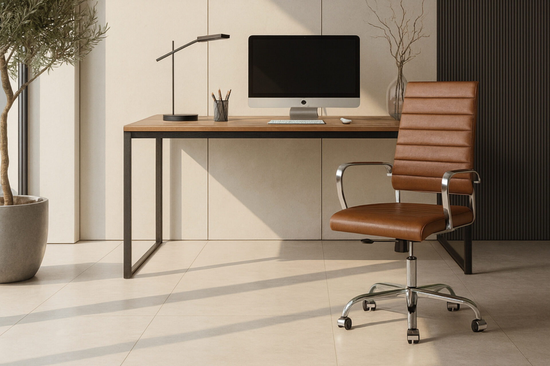 ブラウンのベーガンレザーとクロムベースを備えたラグーナハイバックオフィスチェアは大胆な洗練と人間工学的なケアを組み合わせています。暖かみのあるベーガンレザーでアップホルスタードされ、磨かれたクロムベースにセットされており、どんなワークスペースにも奥行きとモダンなエレガンスをもたらします。背の高い背もたれ、腰のサポート、そして調整可能な機能が自然な姿勢と持続的なウェルビーイングを促進し、長時間の仕事中でも快適さを提供します。360°回転可能な機動性と高品質な職人技術を備えたラグーナは、快適さ、スタイル、そしてパフォーマンスを等しく提供します。あなたのワークスペースを洗練された隠れ家に変えます。