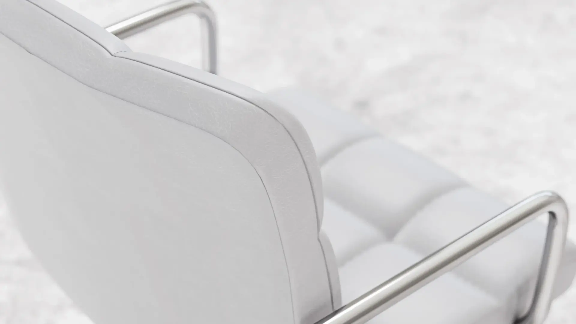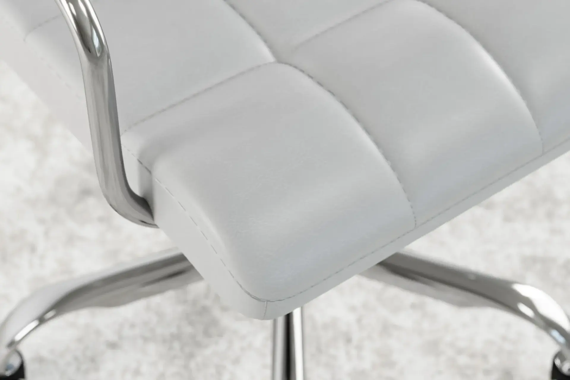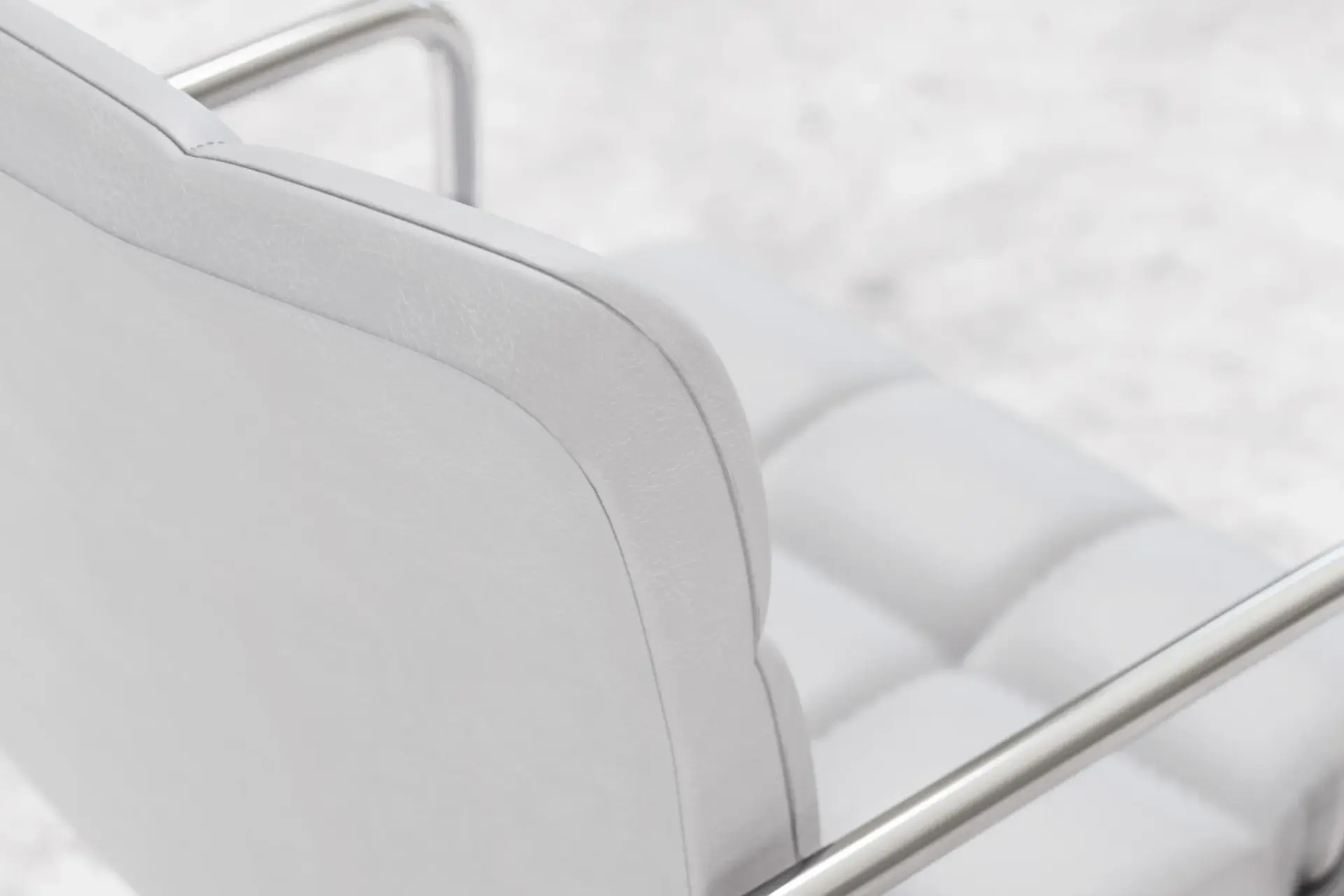 フューチュラオフィスチェアは、クロムベースとホイールで仕上げたホワイトベーガンレザーが、スカンジナビアのミニマリズムと持続的なサポートを融合しています。 ブレスレットステッチが施されたベーガンレザーでアップホルスタリーされており、日常の快適さを確保しています。 滑らかなホイールの付いた磨かれたクロムベースが安定性と機動性を提供し、洗練されたモダンなワークスペースに最適です。
