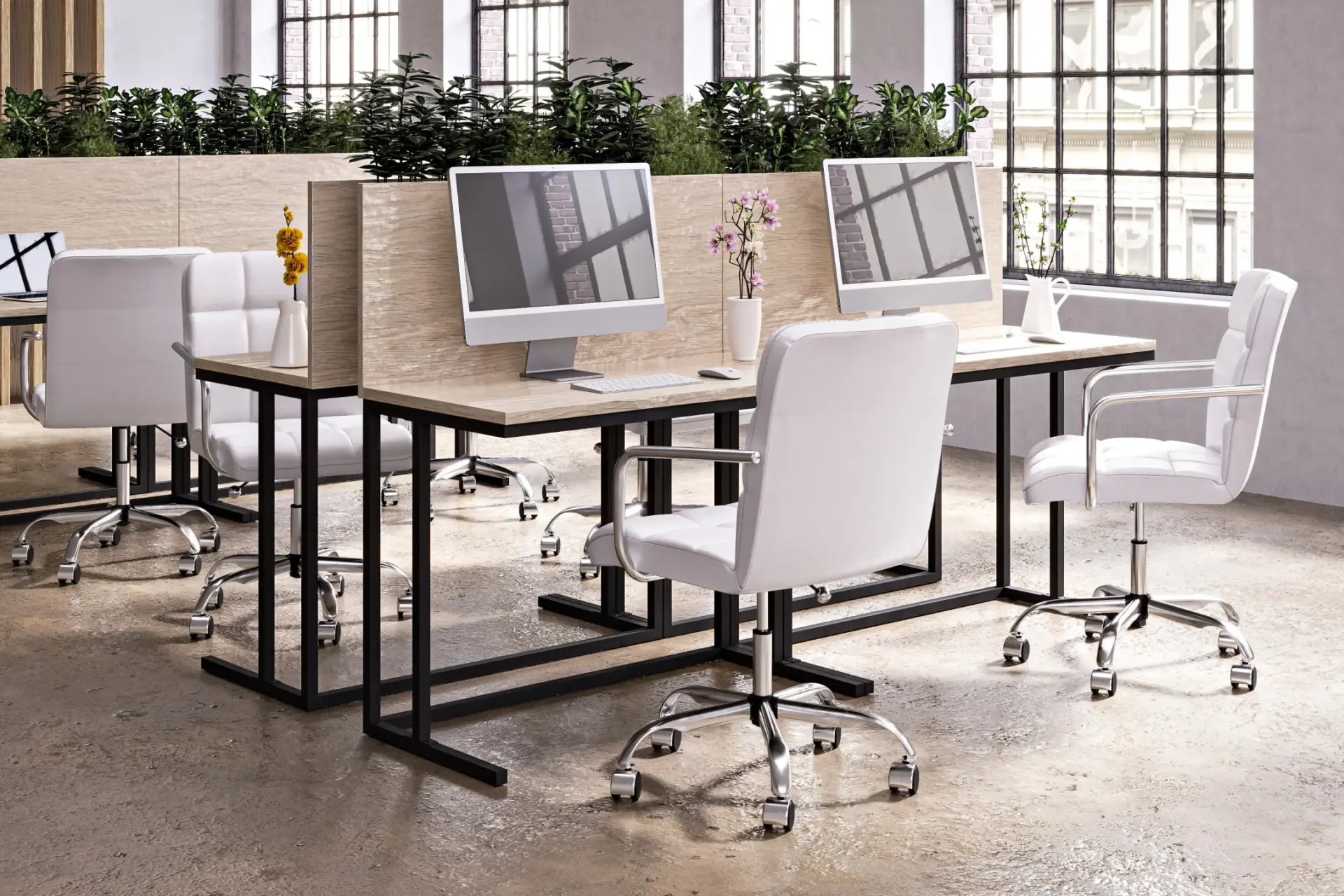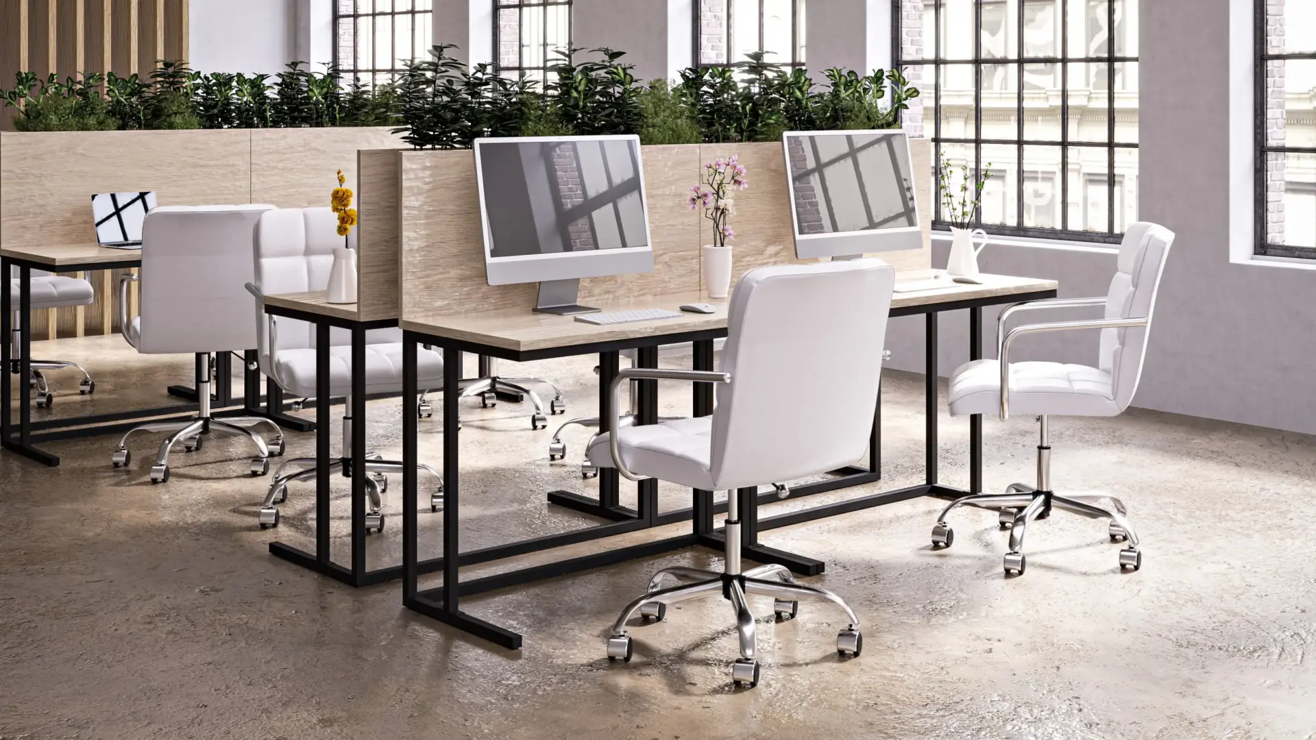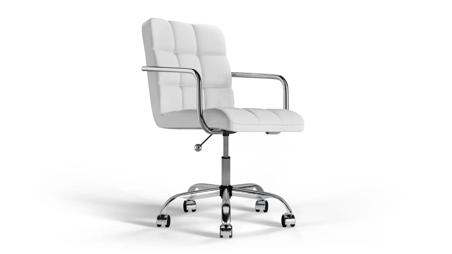 フューチュラオフィスチェアは、クロムベースとホイールで仕上げたホワイトベーガンレザーが、スカンジナビアのミニマリズムと持続的なサポートを融合しています。 ブレスレットステッチが施されたベーガンレザーでアップホルスタリーされており、日常の快適さを確保しています。 滑らかなホイールの付いた磨かれたクロムベースが安定性と機動性を提供し、洗練されたモダンなワークスペースに最適です。