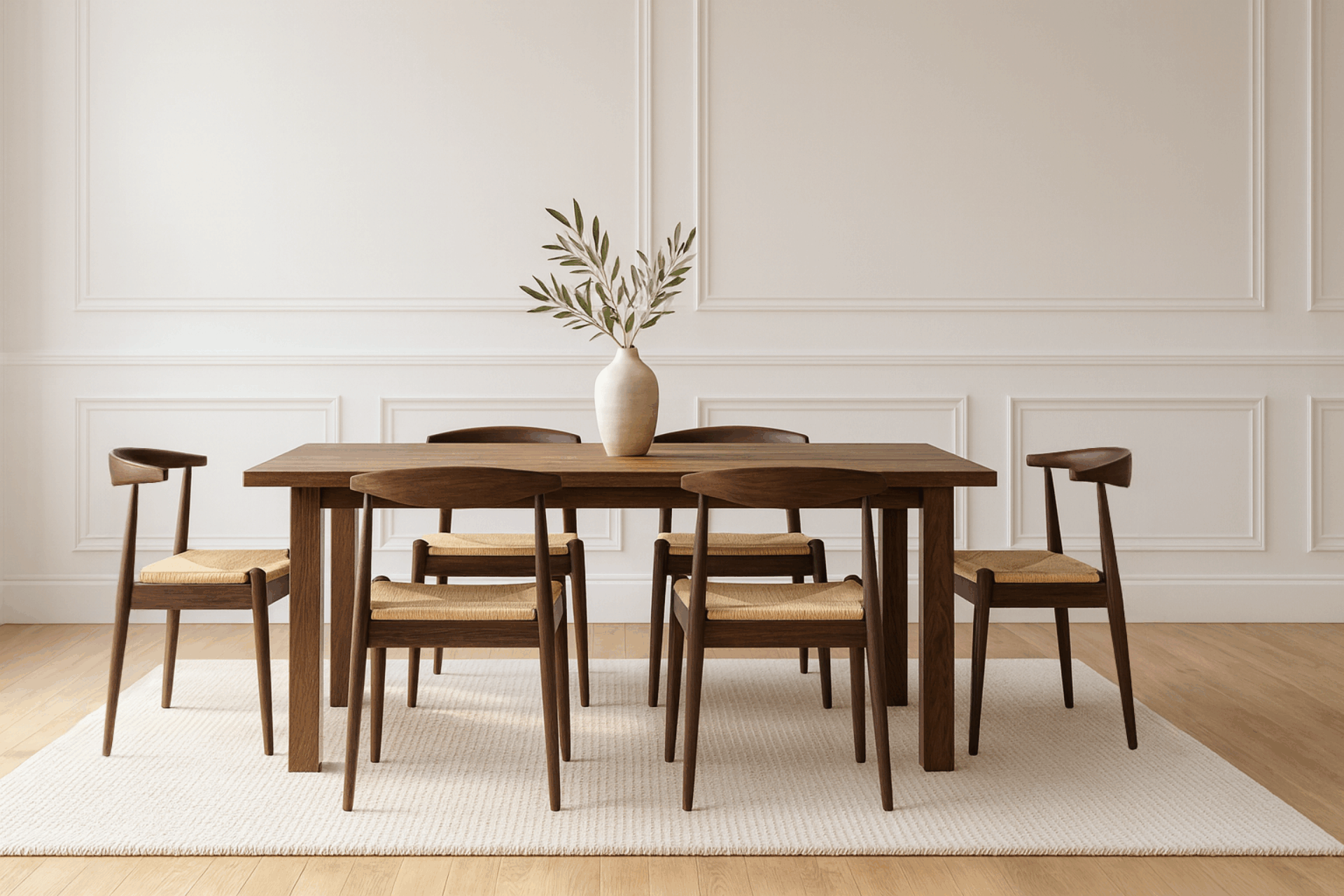 ウォールナット製のTorstenダイニングチェアは、豊かな木の色合いとナチュラルな編み座面と背もたれを組み合わせています。エレガントな対比と頑丈なフレームは温かみと洗練をもたらし、全ての食事が洗練された魅力ある体験となります。