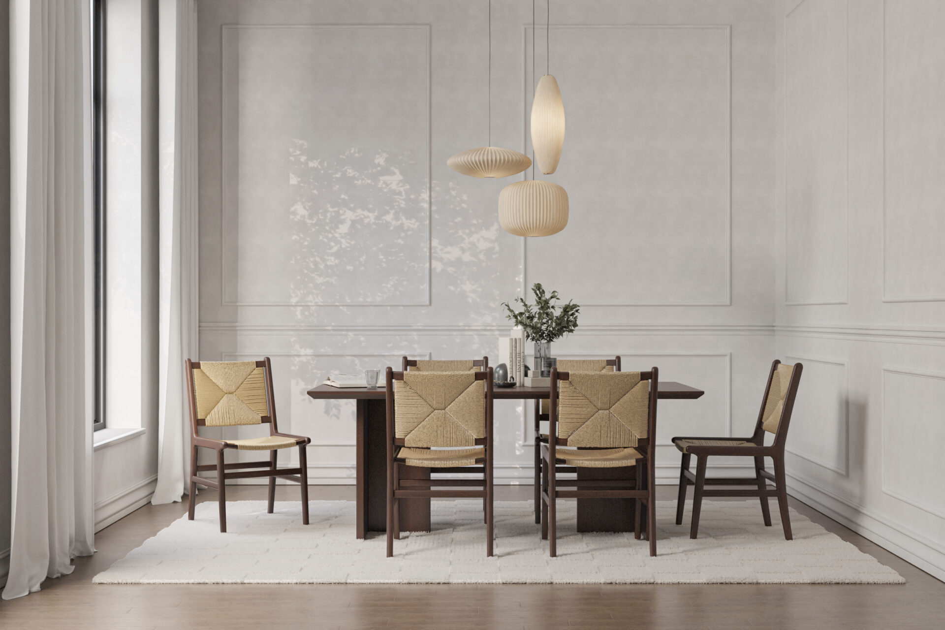ウォールナ ダイニングチェアは、ウォールナット材で作られており、ミッドセンチュリーの洗練さとノルディックな快適さを融合しています。深いウォールナットの仕上げは、天然の手織りペーパーコードのシートや背もたれと美しく対比し、奥行き、暖かさ、そして質感を生み出しています。クリーンなシルエットからタクタイルな素材まで、すべてのディテールが卓越した職人技を反映しています。モダンなインテリアにもクラシックなインテリアにも理想的で、ウィノナは持続的な快適さとスタイルを提供し、長時間リラックスした食事や意義深い会話を誘います。エレガンスの真の表現であり、どんな食事空間にも時代を超えたキャラクターと居心地の良い洗練さをもたらします。