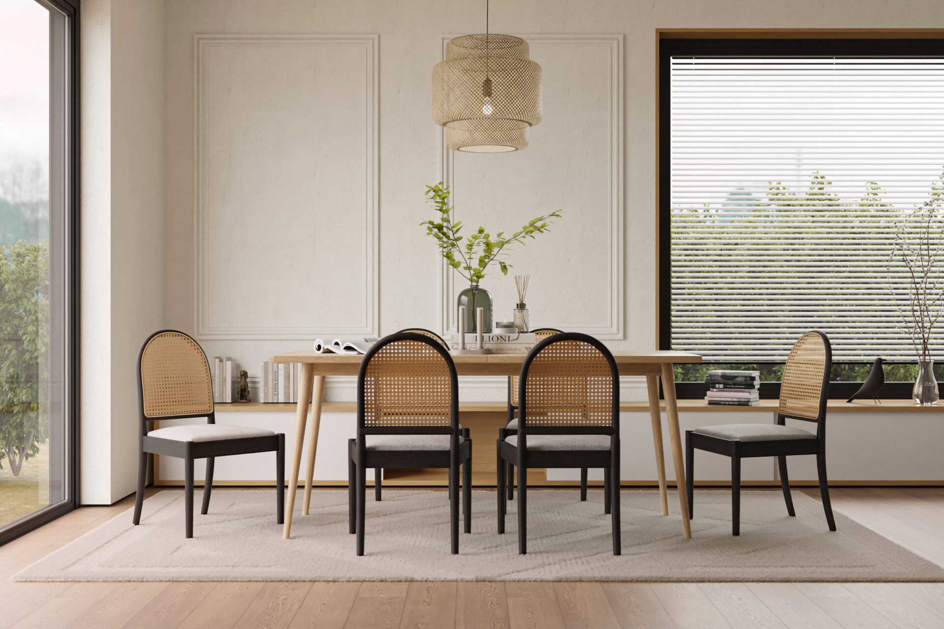 Yuna Dining Chairコレクションをご覧ください — 快適さと個性が時代を超えるデザインと出会います。ブラック、オーク、ウォールナットの仕上げからお選びいただけます。柔らかなブークレ生地のシートと編まれたラタンの背もたれがそれぞれの仕上げを引き立てます。繊細な質感と洗練されたフォルムで、Yunaはどんなダイニングシーンにも温かみと効果的なエレガンスをもたらします。