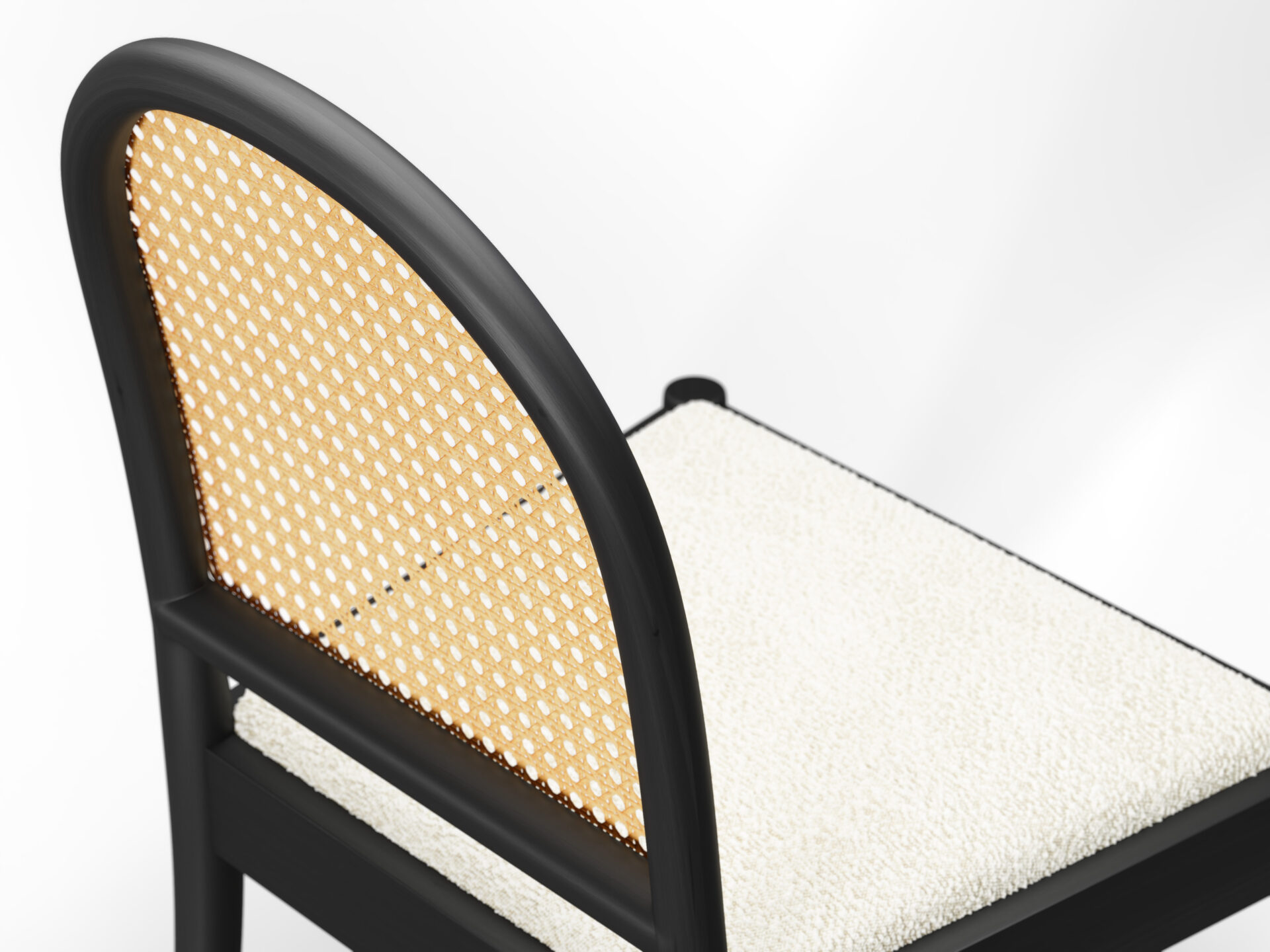 黒い木材は時代を超えた構造と視覚的な奥行きを提供し、一方、白いブークレは触感のある雲のような質感で招く柔らかさを追加します。編まれたラタンは通気性と自然な暖かさをもたらし、耐久性、快適さ、コントラストのバランスのとれた混合物を作り出し、洗練されたが自然な感じを与えます。