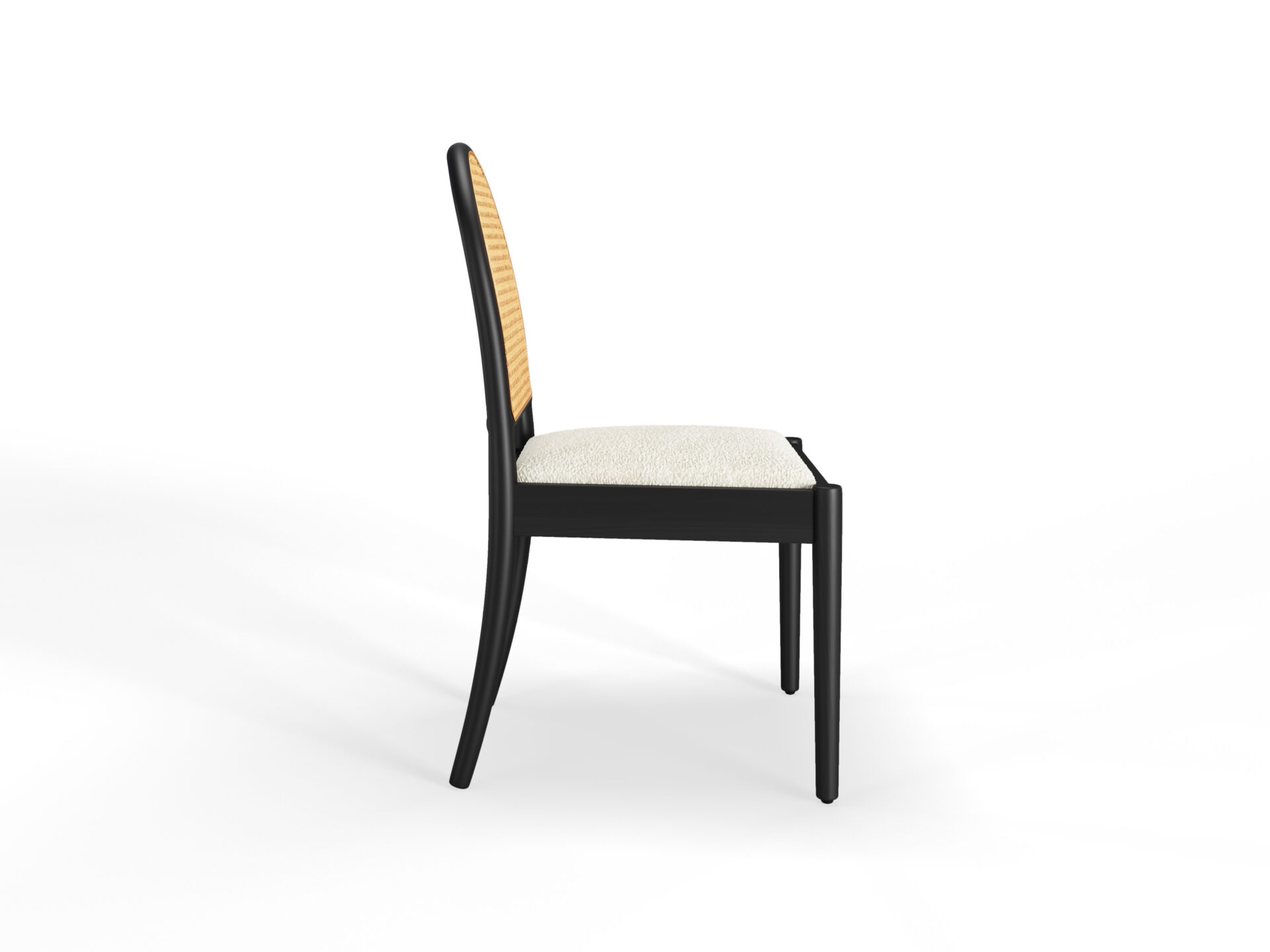 スリークで現代的なデザインのYuna Dining Chairは、白いブークレの座面と編み込みラタンの背もたれと美しい対照をなしています。モダンなダイニングスペースに最適な質感とトーンの洗練されたミックスです。